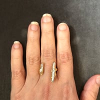 14k gold filled band with cubic zirconia on one end and a large freshwater pearl at the other, set in beach sand for texture and then encapsulated in copper