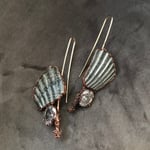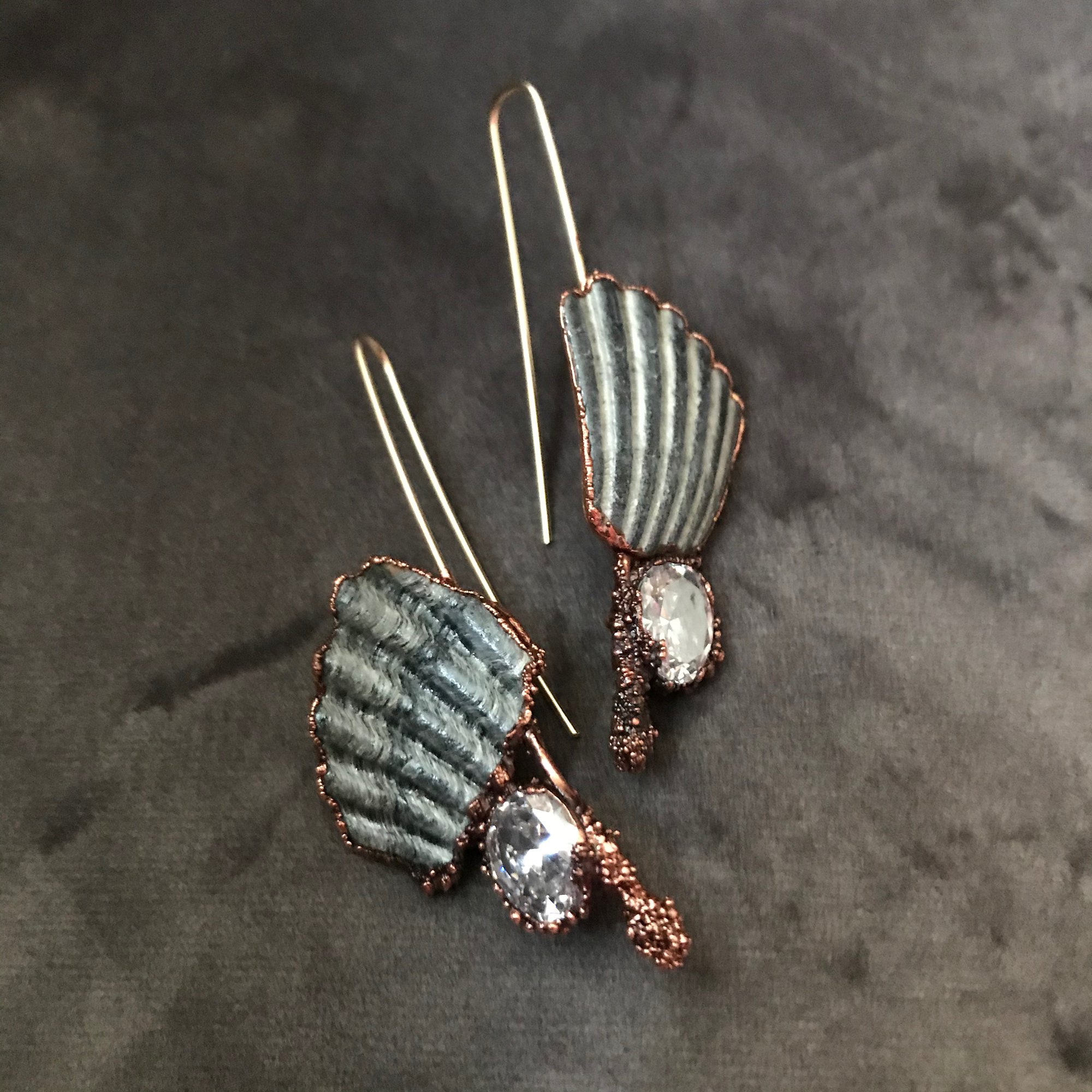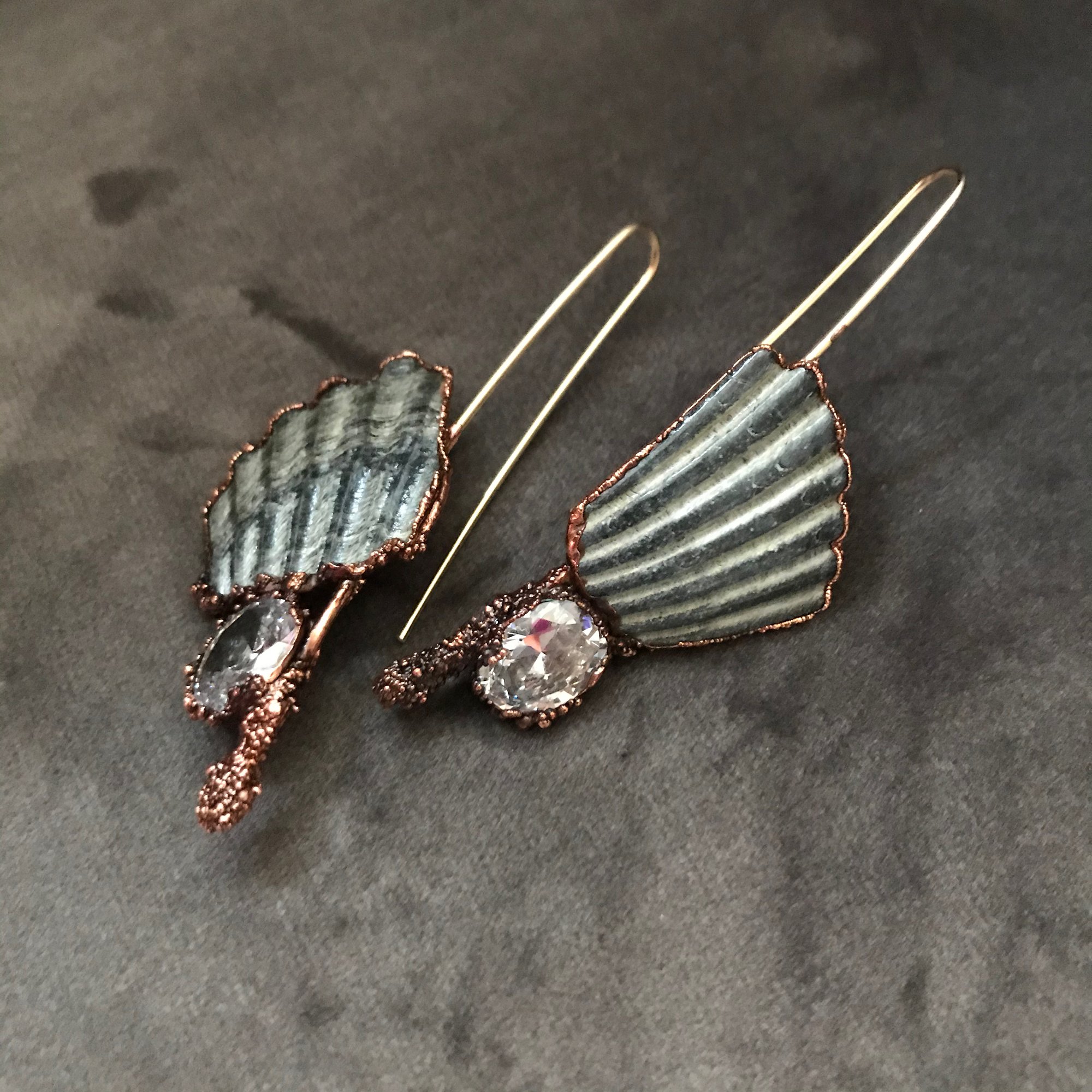 Black scallop shell fragments are set with a pinch of sand and highlighted with generous oval cubic zirconia to add a bit of everyday sparkle. Encapsulated in copper on 14k GF ear wires. Naturally asymmetrical but balanced. Approximately 2.5" drop.