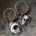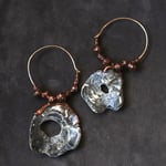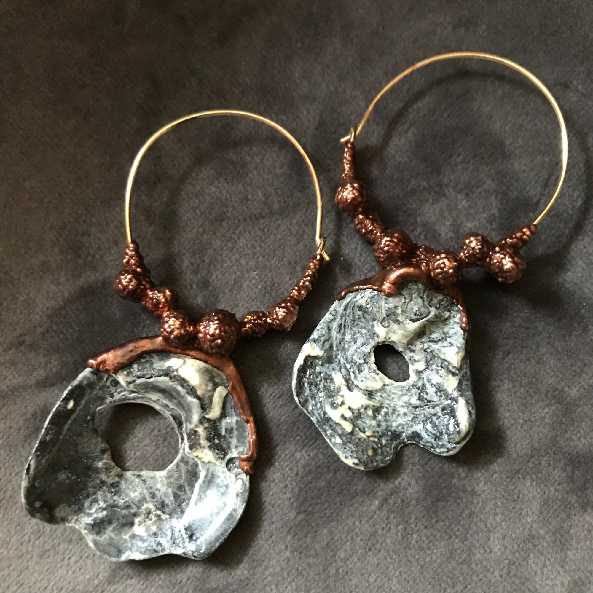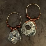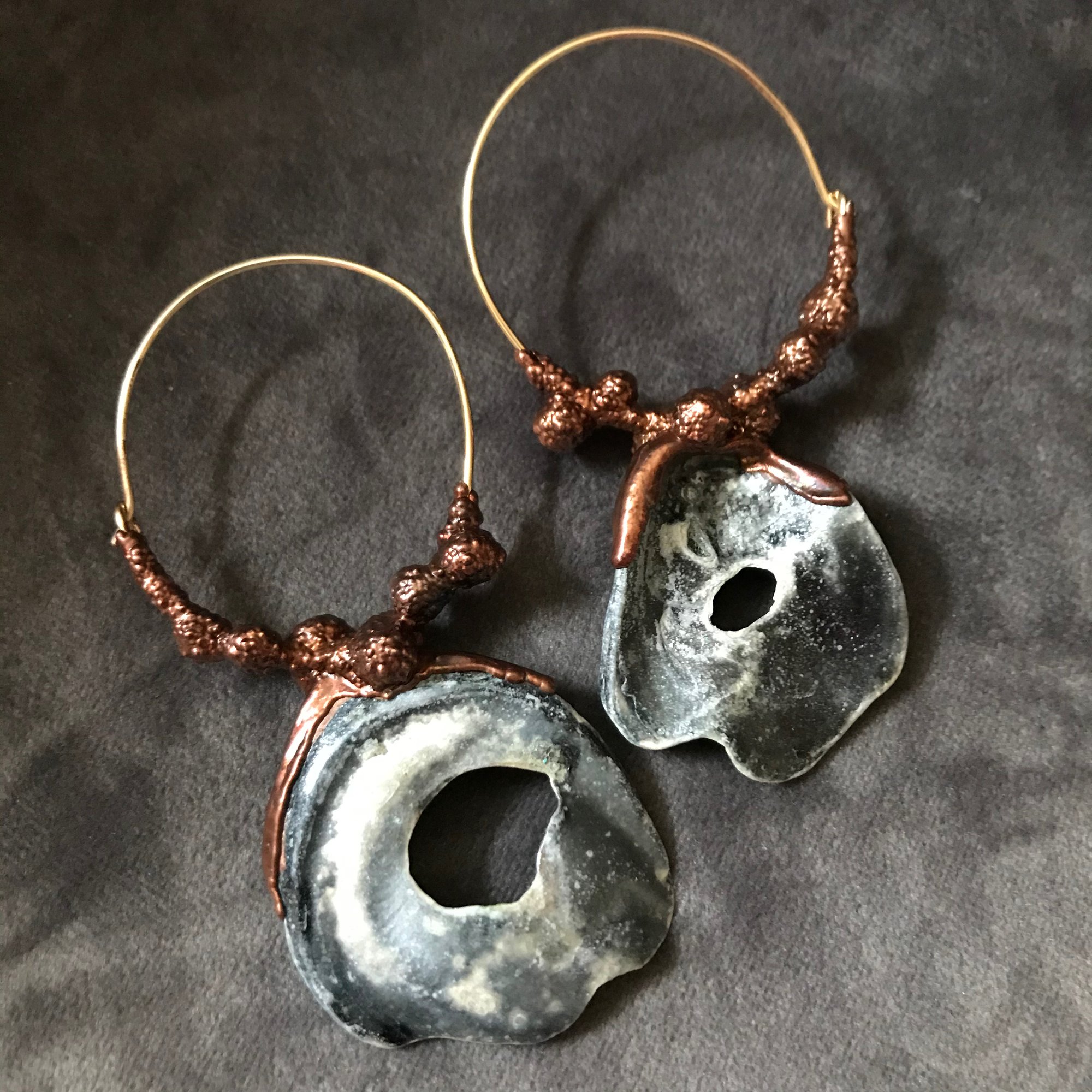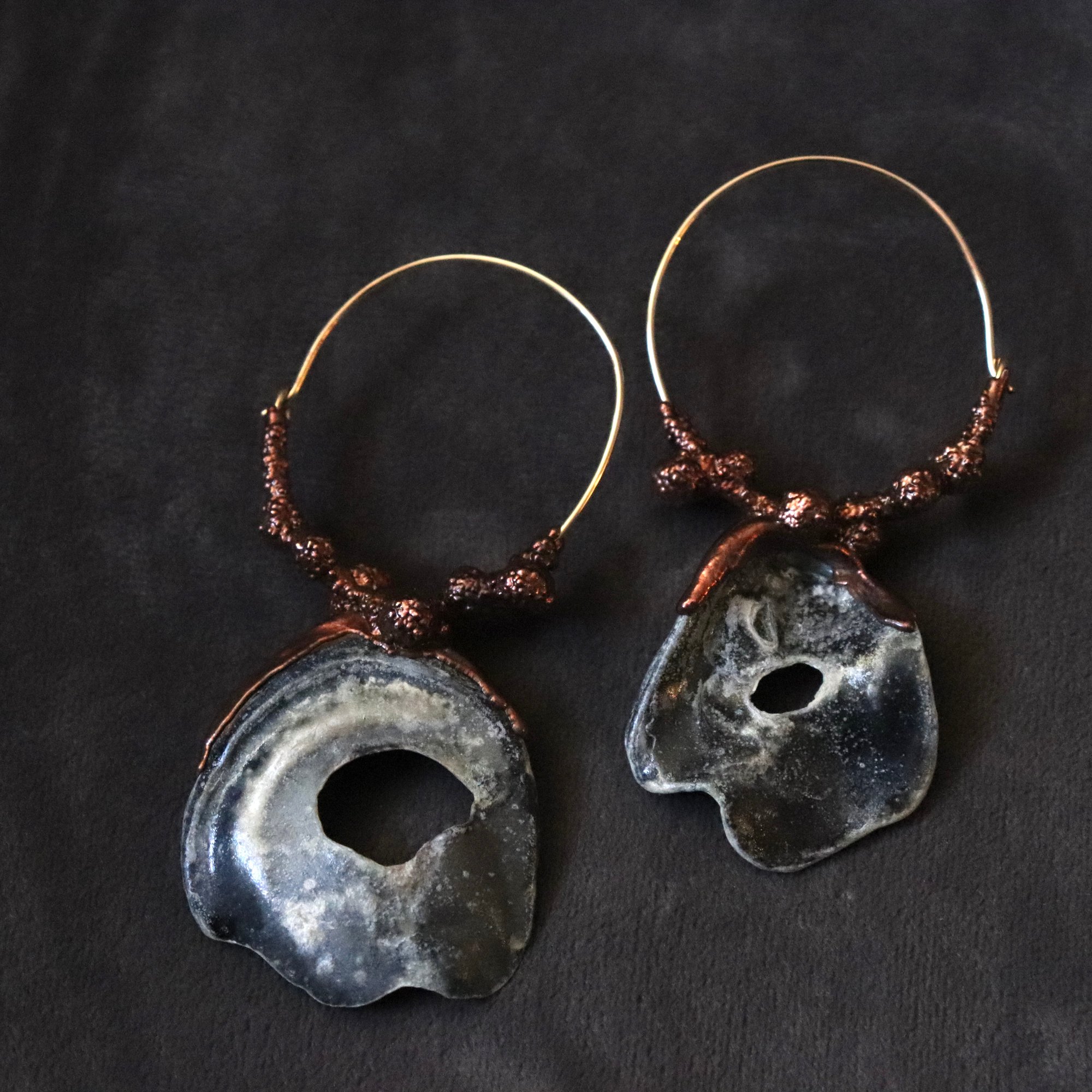 Shimmering black shell fragments are set with a pinch of sand and designed for everyday wear. Reverse side is a bit more textural and can be worn either side facing out. Encapsulated in copper on 14k GF ear hoops. Naturally asymmetrical but balanced. Copper encapsulation is accumulated as thin as structurally possible to make them lightweight Approximately 2.75" drop on longer earring.