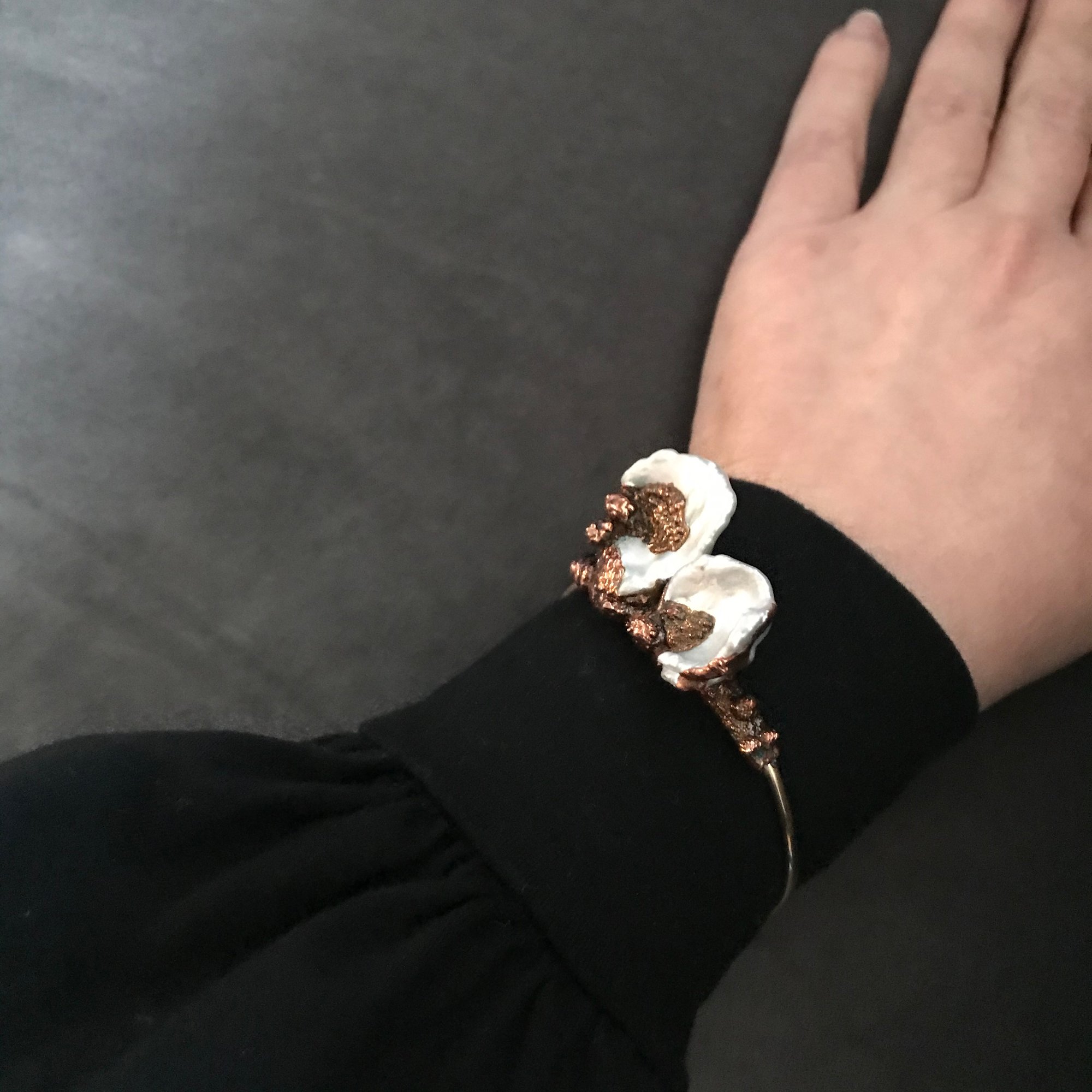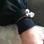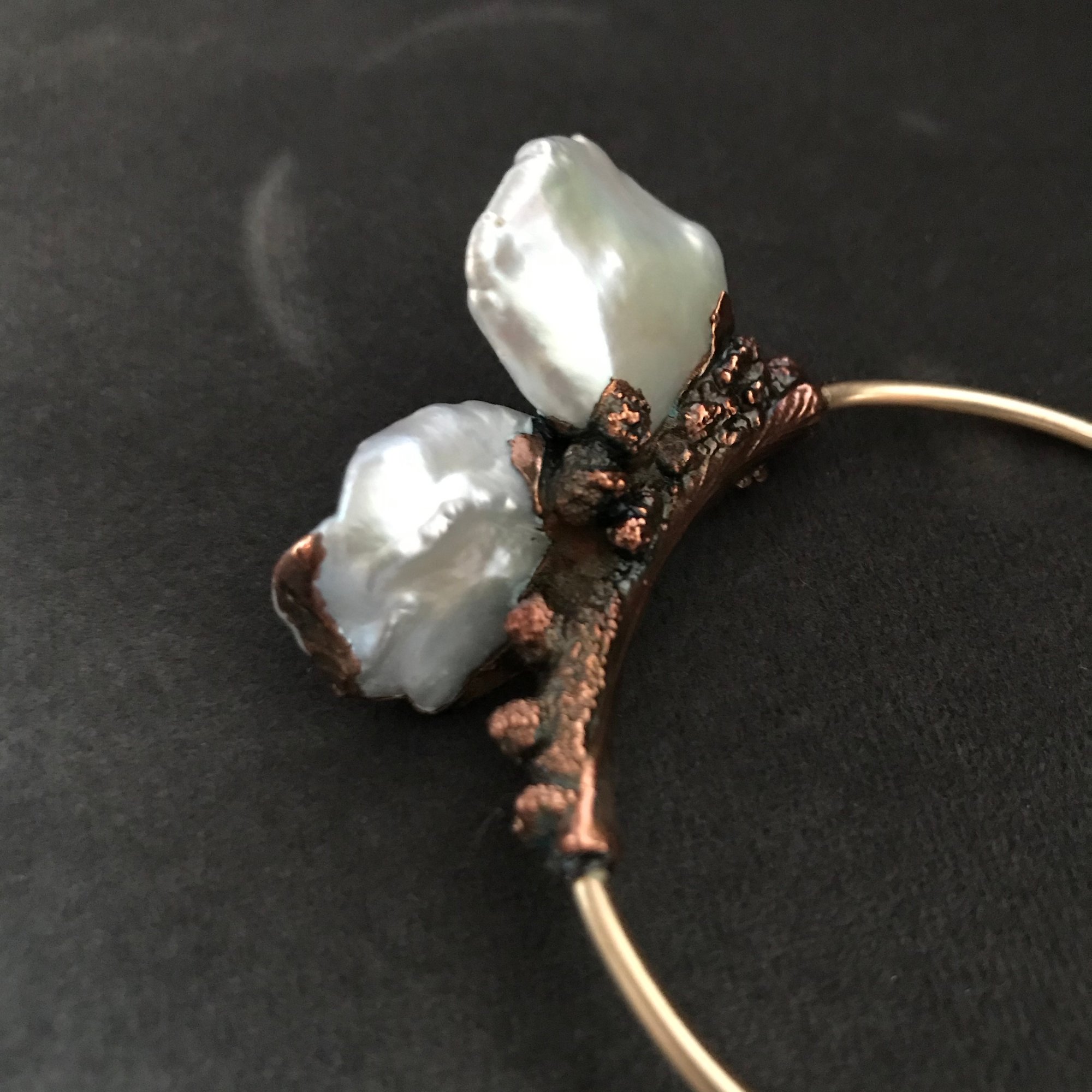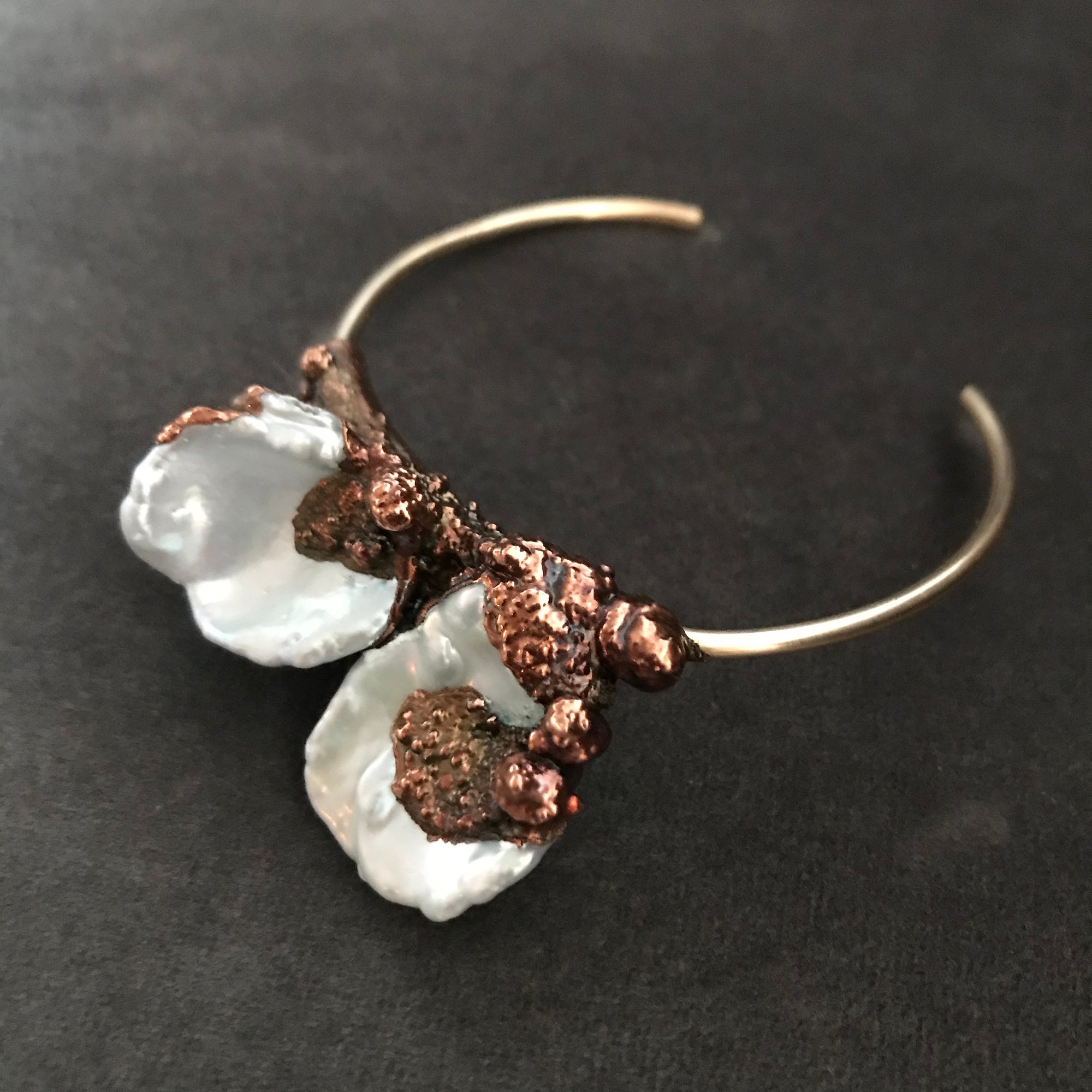 slimline cuff set with a pair of luminous white pearls set in authentic beach sand is encapsulated inside a shell of copper
