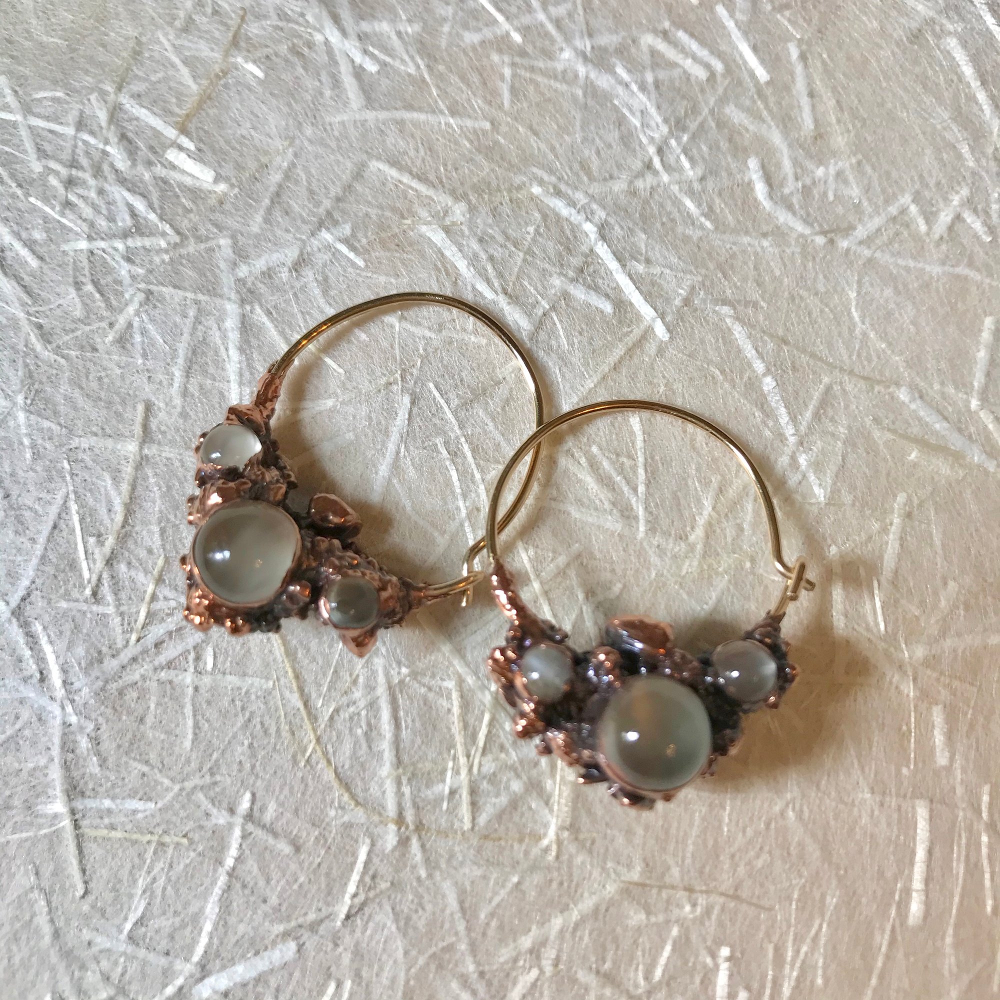 Beach sand is set with a dozen moonstone droplets and encapsulated in copper in hoops meant for everyday wear. 14k GF ear wires. 1 1/8" drop.